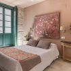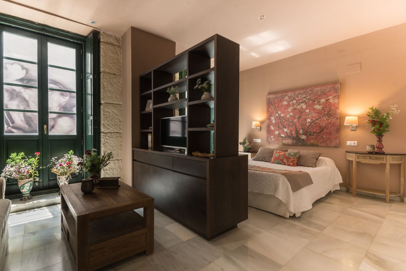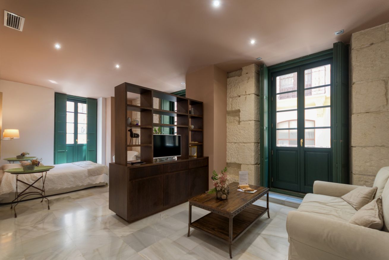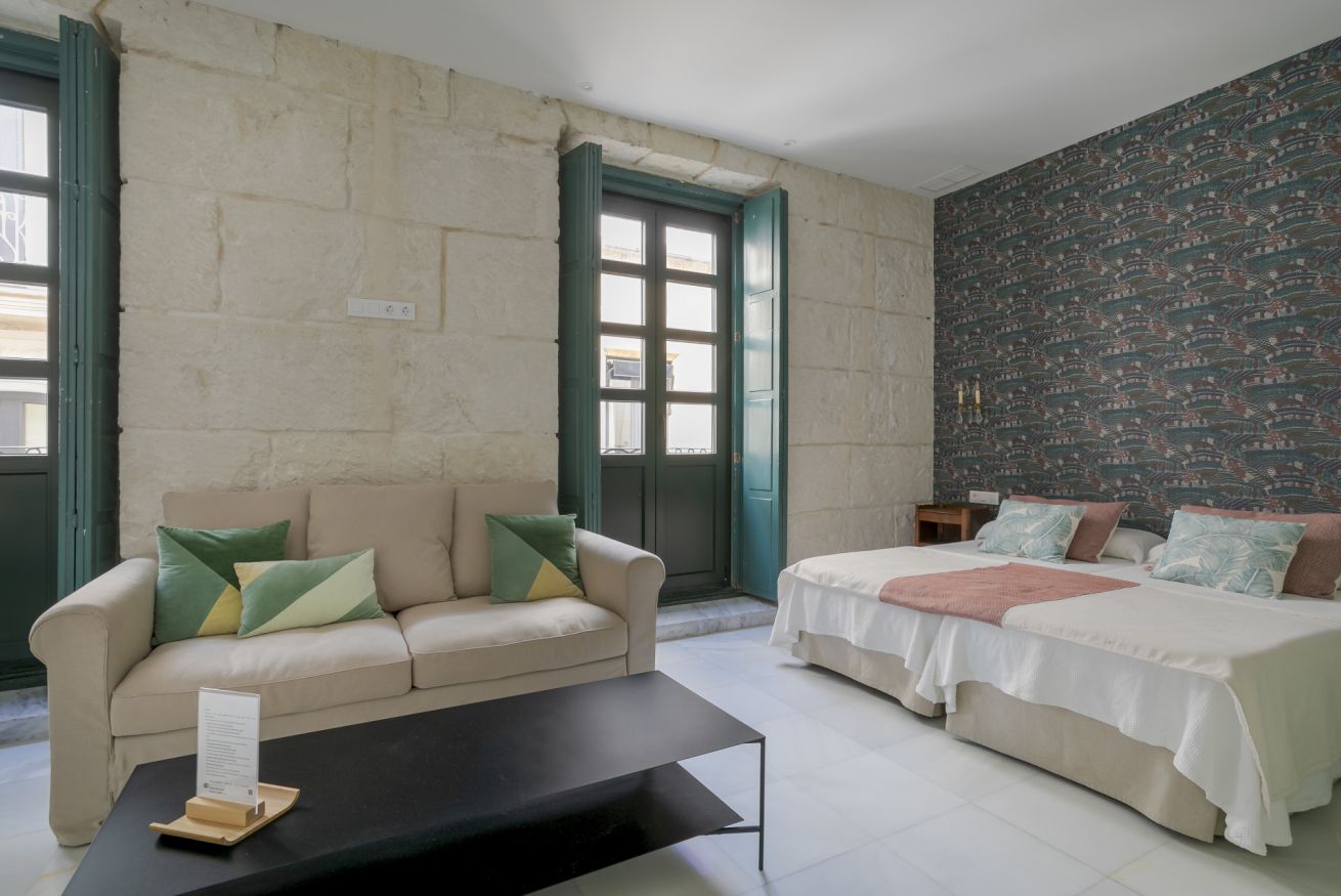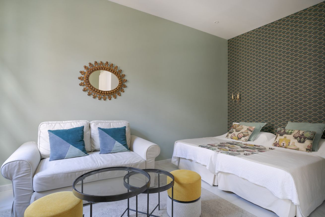 Suite exterior con una luz natural espectacular gracias a sus ventanales estilo francés. Ideal para estancias medias. Capacidad para 2 personas en cama doble + 1 persona en sofá cama.