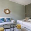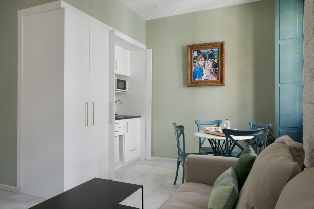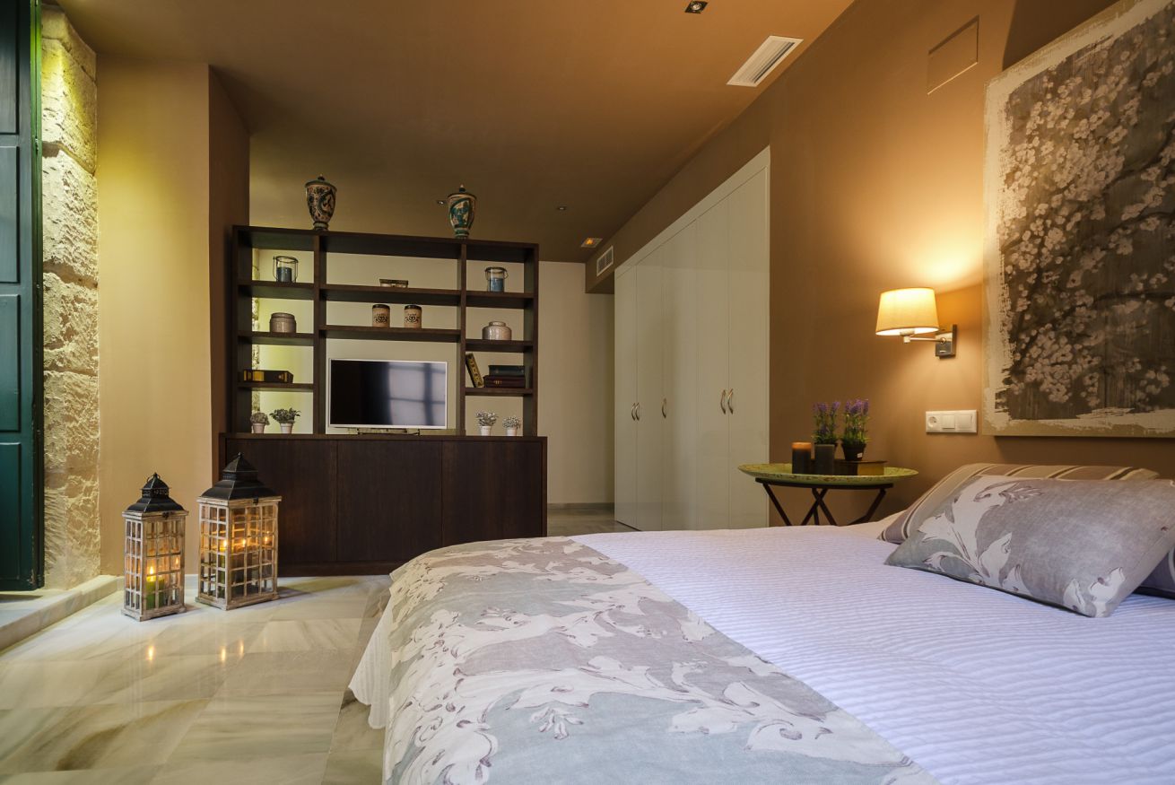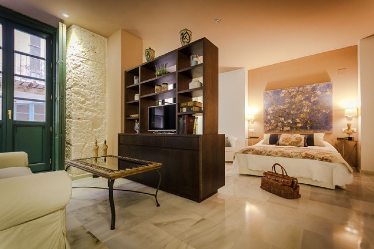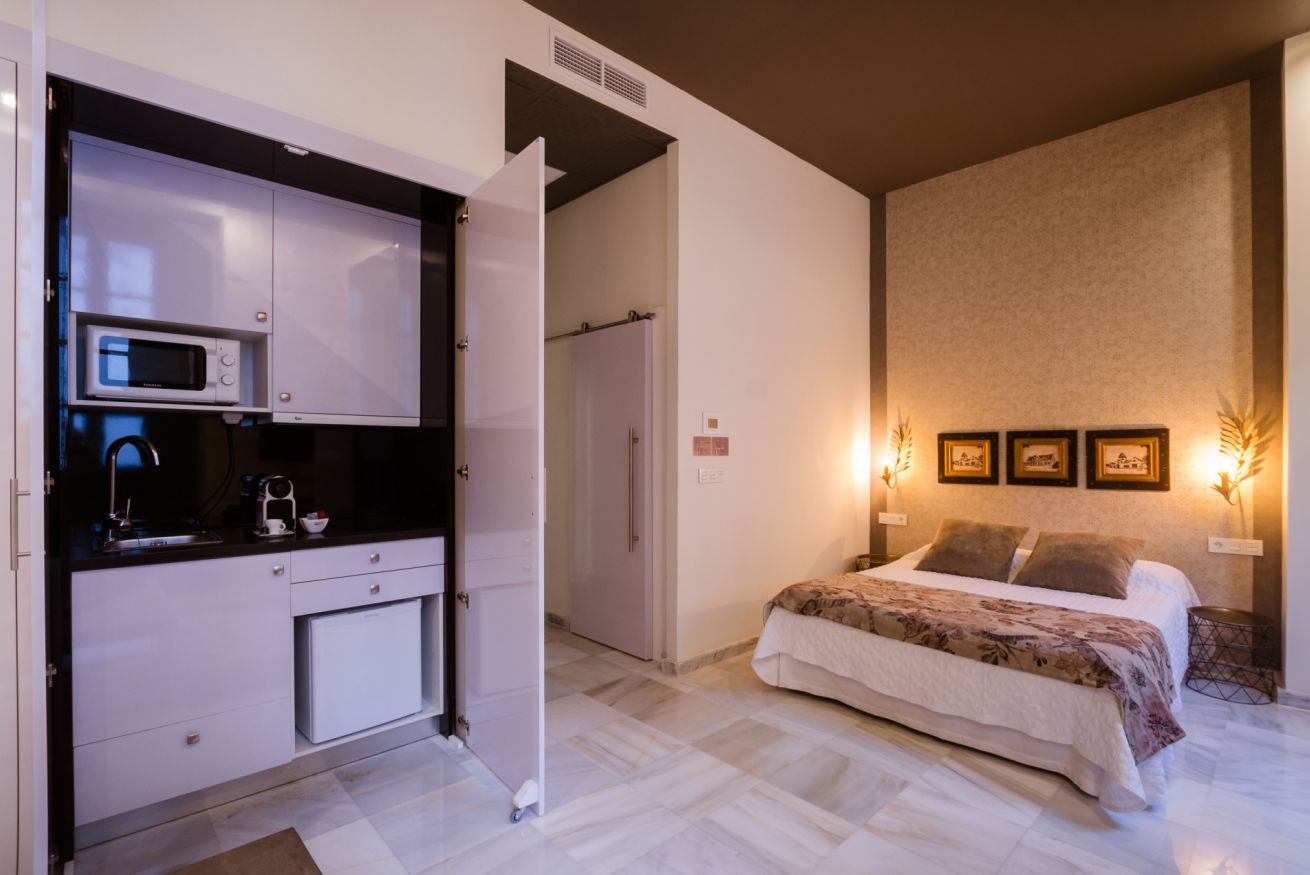Suite exterior con una luz natural espectacular gracias a sus ventanales estilo francés. Ideal para estancias medias. Capacidad para 2 personas en cama doble + 1 persona en sofá cama.